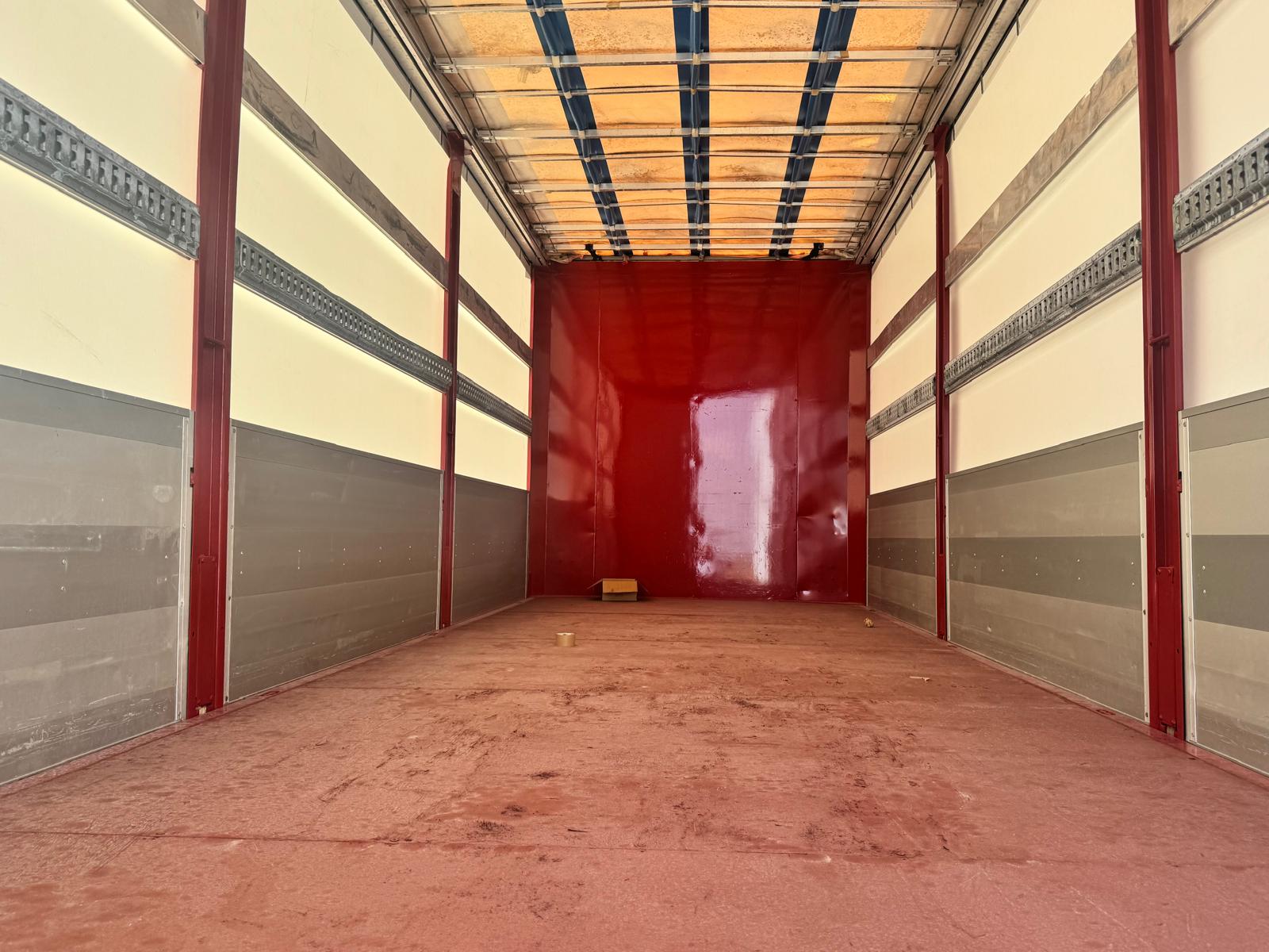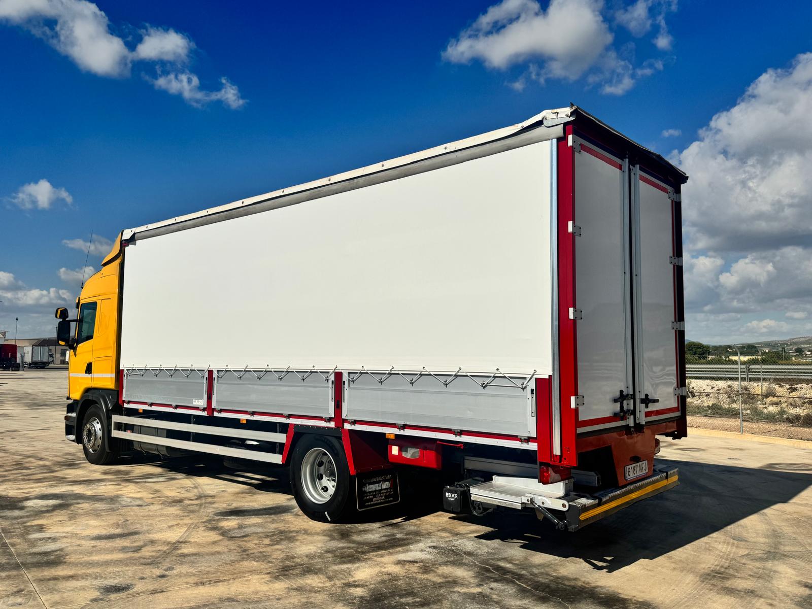 Dispone de cambio automatico, normativa euro 6, suspension neumatica, carroceria de ocasion semitautliner con lonas nuevas de 7.73 metros interior con techo corredero, puerta elevadora de ocasion tipo retractil BAR CARGOLIFT de 1.500 kg etc...