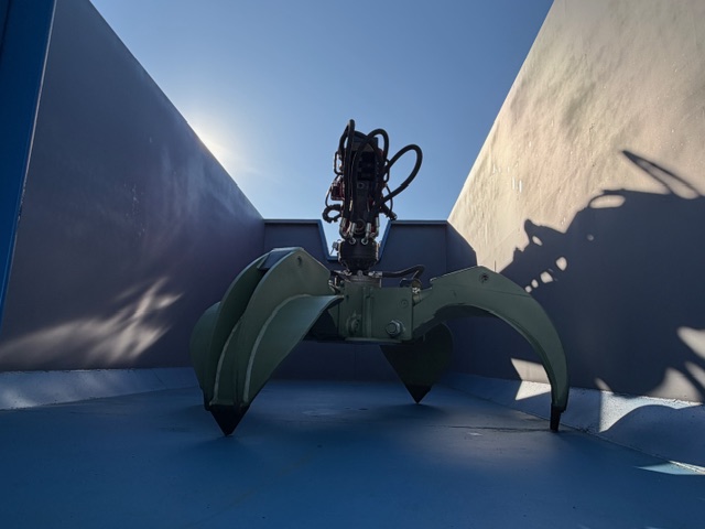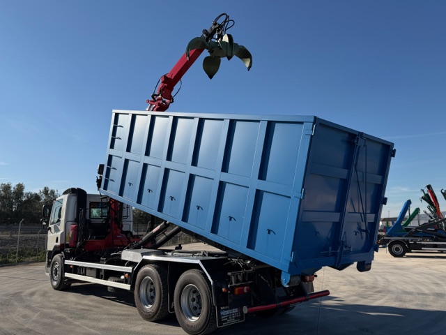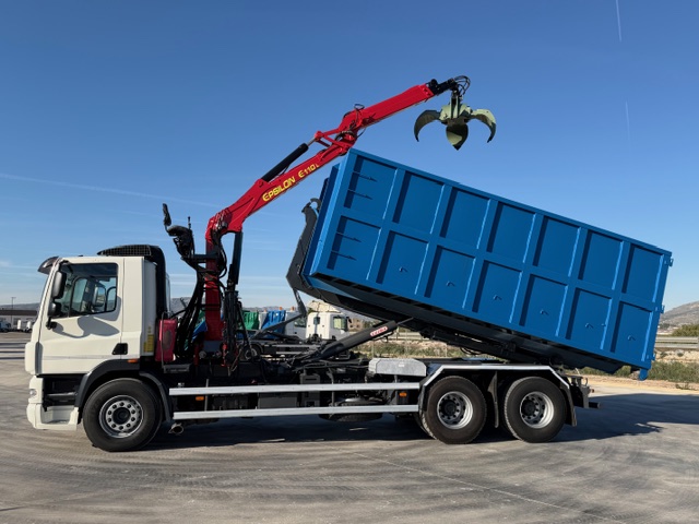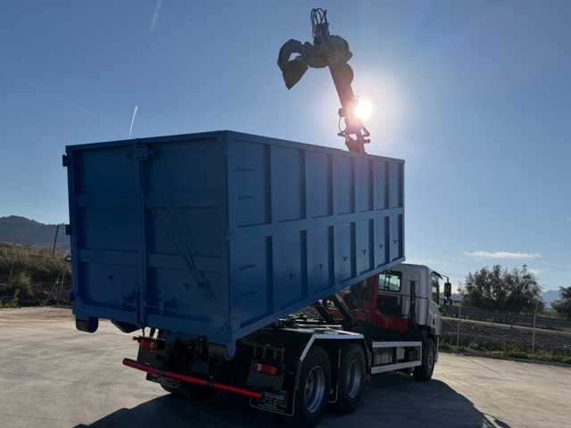 Dispone de retarder, Grua de ocasion marca EPSILON E110L74 con pulpo nuevo FERNIE de 4 garras y rotator. Equipo portacontenedores Guima de 20 toneladas para cajas de 6 metros. Carroceria nueva tipo chatarrera de 6.00 metros de longitud.