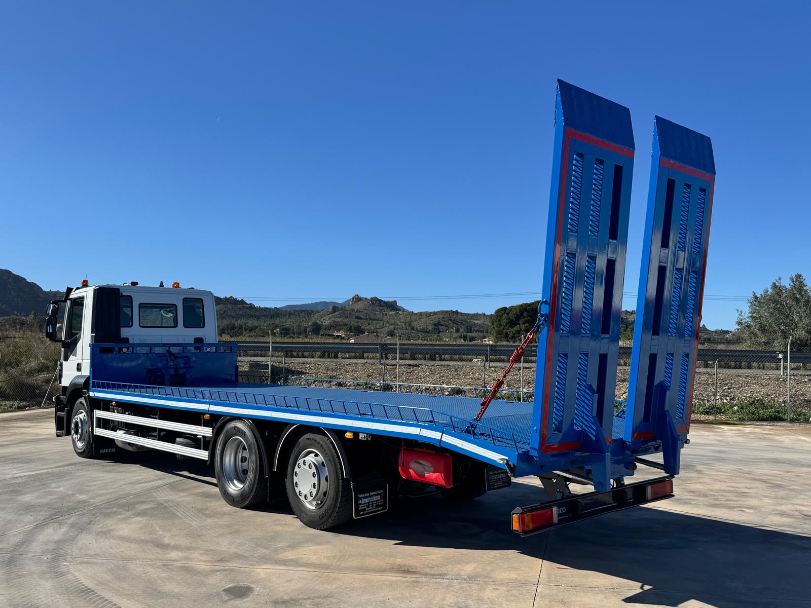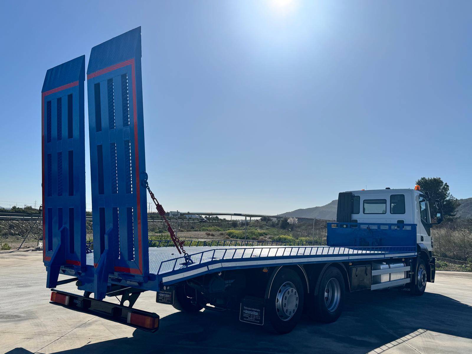 Dispone de caja de cambios automatica, eje elevable y direccional, carroceria portamaquinaria de ocasion con dos rampas individuales hidraulicas de 8.53 metros interior. Cabrestante hidraulico de 5.400 kg de arrastre etc...